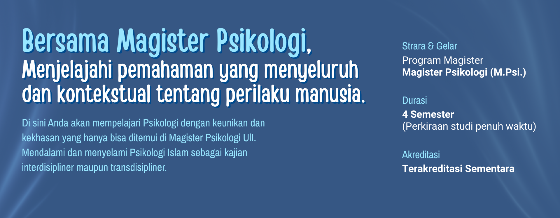 Dalam kehidupan akademis – pendidikan akan berhubungan dengan bidang ilmu (studi) tertentu. Jika mendengar mengenai kehidupan akademis di Psikologi UII ~ di bayangan sebagian orang akan terbayang hal-hal mencakup keilmuan Psikologi dan Islam. Testimoni dari sebagian besar orang lulusan, Psikologi UII tidak hanya mengenai pengetahuan, melainkan ada atmosfer yang mendukung pada pengembangan diri dalam hal Psikologi dan penguatan keIslaman dalam diri. Hal inilah yang menjadi keunggulan dalam Magister Psikologi UII. Tiap momen, tiap tempat, tiap orang, tentu menciptakan situasi dan menuntut sikap dan tindakan tertentu. Sebagai lulusan dengan gelar Magister (baca dalam bahasa inggris: Master), maka terdapat tuntutan penguasaan keilmuan yang lebih tinggi dalam bidang Psikologi dan Islam. Islam dan psikologi di Magister Psikologi UII tidak akan terbatas pada pengetahuan saja.